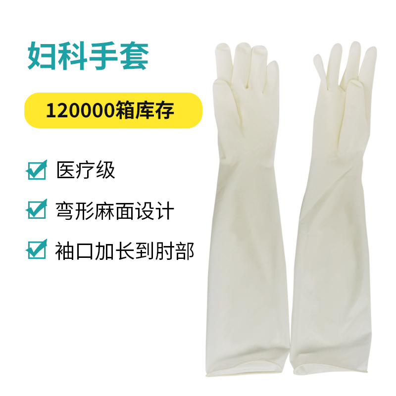 長度≥480cm 分左右手,天然橡膠制成,彈性好,彎形設(shè)計,貼合度高,無粉麻面,以增強抓握力,袖口加長型可以戴到肘部,方便醫(yī)生診療,適用于婦科檢查和婦科診療。