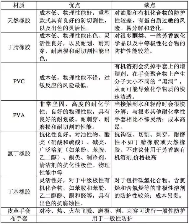 表 1 各種手套的優(yōu)缺點(diǎn)