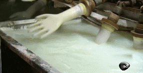 經(jīng)過前面一系列處理后,手套模型終于要浸過液體橡膠了。橡膠與之前殘留在模型上的化學(xué)試劑發(fā)生反應(yīng),形成膠狀的合成橡膠。穿戴由這種合成橡膠制成的手套還可以防止對自然橡膠的過敏。