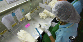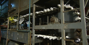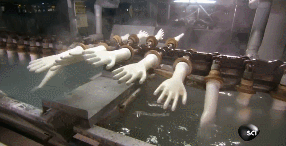 再經(jīng)過漂白水消毒。每個手套模型都必須清洗干凈,因為哪怕是一點點的小雜質(zhì),都會殘留在橡膠手套中,甚至導(dǎo)致手套破洞。