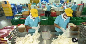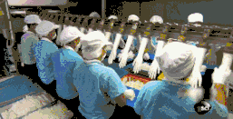 玉米淀粉會被當(dāng)做潤滑粉附著到手套上,一是防止手套粘黏在盒子里,二是方便以后的穿戴。之后每100個手套會被工人裝到盒子里,大概一個工廠每小時可以生產(chǎn)1萬2前個手套。