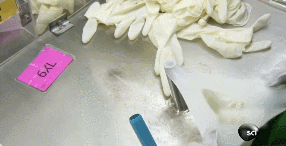 這種合成橡膠制成的手套比純天然的橡膠手套粘性高一點,所以必須用手移除。