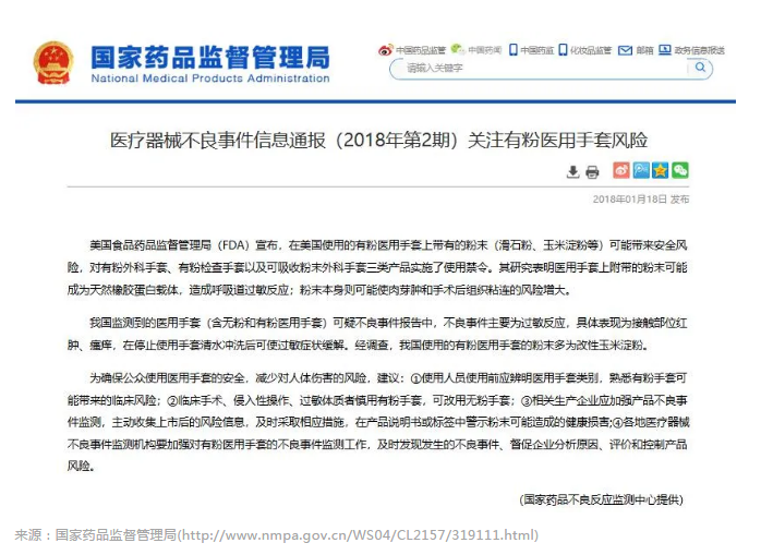 早在2016年,美國(guó)食品藥品監(jiān)督管理局(FDA)宣布,在美國(guó)使用的有粉醫(yī)用手套上帶有的粉末(滑石粉、玉米淀粉等)可能帶來(lái)安全風(fēng)險(xiǎn),對(duì)有粉外科手套、有粉檢查手套以及可吸收粉末外科手套三類(lèi)產(chǎn)品實(shí)施了使用禁令。其研究表明醫(yī)用手套上附帶的粉末可能成為天然橡膠蛋白載體,造成呼吸道過(guò)敏反應(yīng);粉末本身則可能使肉芽腫和手術(shù)后組織粘連的風(fēng)險(xiǎn)增大。